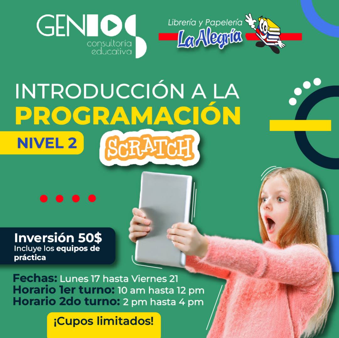 bríndale la oportunidad de profundizar los conocimientos adquiridos en el cuso de programación nivel 2, donde ampliamos los conceptos aprendidos en el nivel 1 e introducimos ideas más avanzadas como condicionales complejos, cadenas, operadores matemáticos, bucles anidados, clonación, listas y funciones; esto les permitirá mejorar sus habilidades de programación, creatividad, razonamiento y resolución de problemas, además de ayudarlos a socializar con jóvenes con sus mismos intereses.